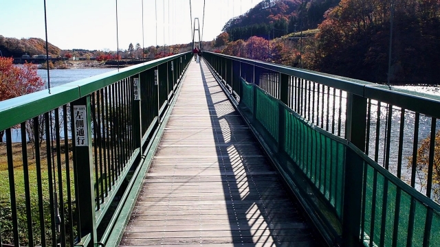 狙う位置吊橋のやや左岸側(駐車場側)に寄った位置から狙うと、紅葉の写り込みが広く入ります。